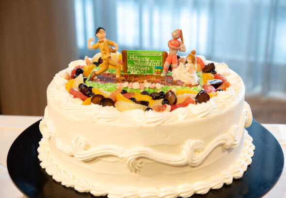 ウェディングケーキの上に飾ったマジパンは新郎様のお友達の手作り。