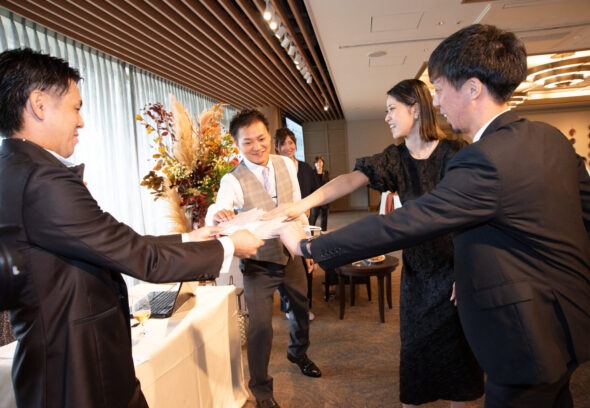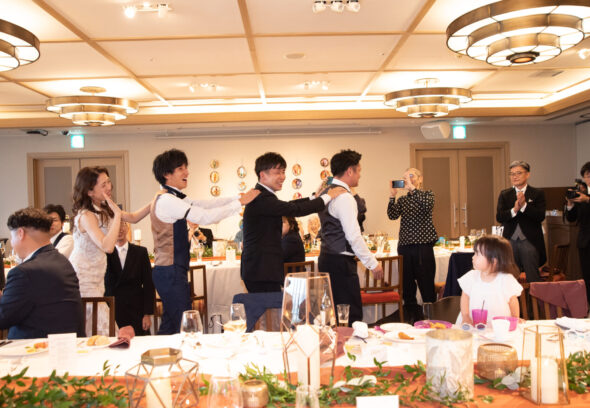 ご新婦様のお色直しの中座はご兄弟と一緒に肩に手をのせて汽車ポッポのポーズで。